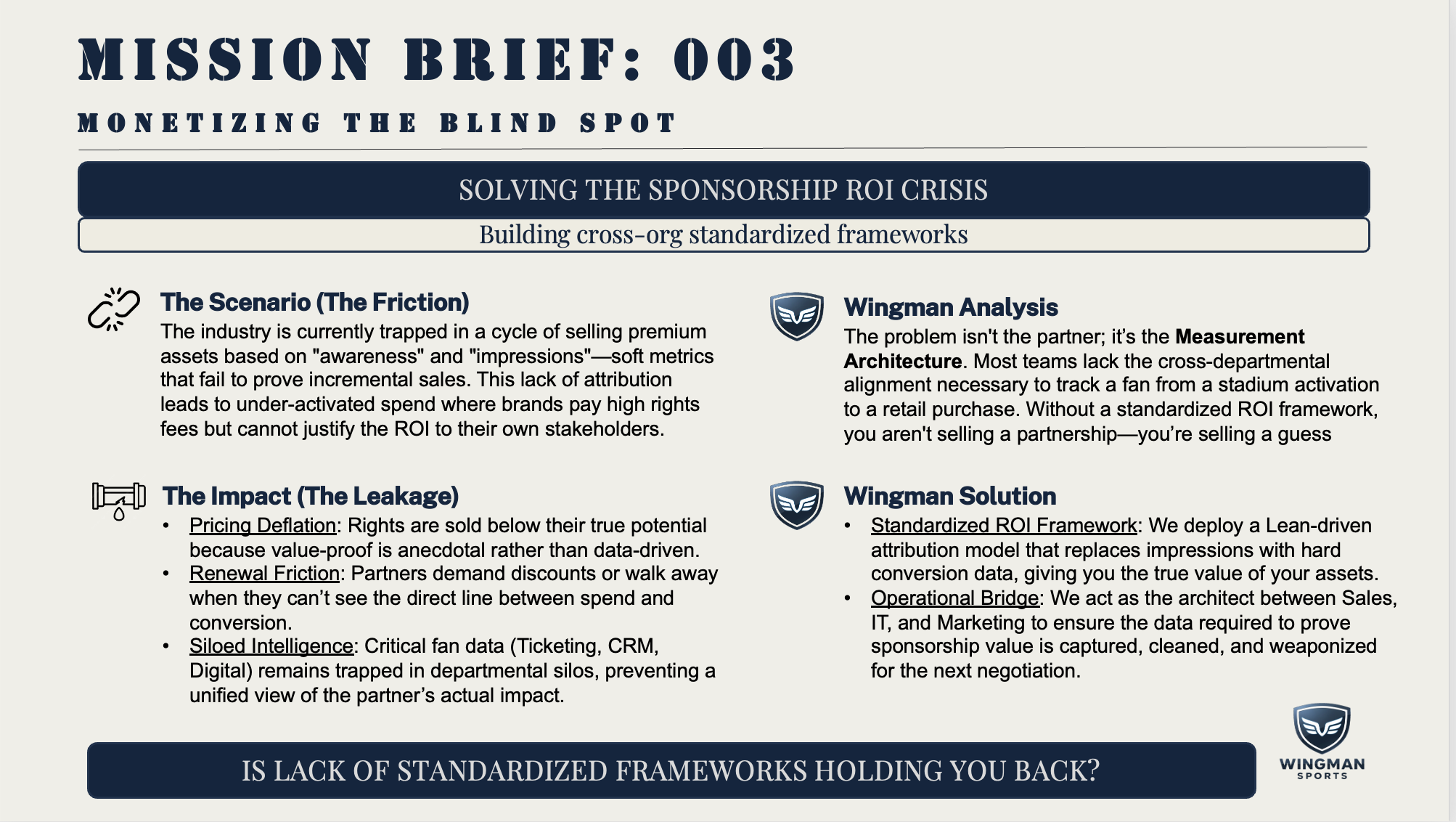 From executive alignment to sustained execution, Wingman Sports helps elite organizations reduce cost, eliminate risk, and operate with discipline.